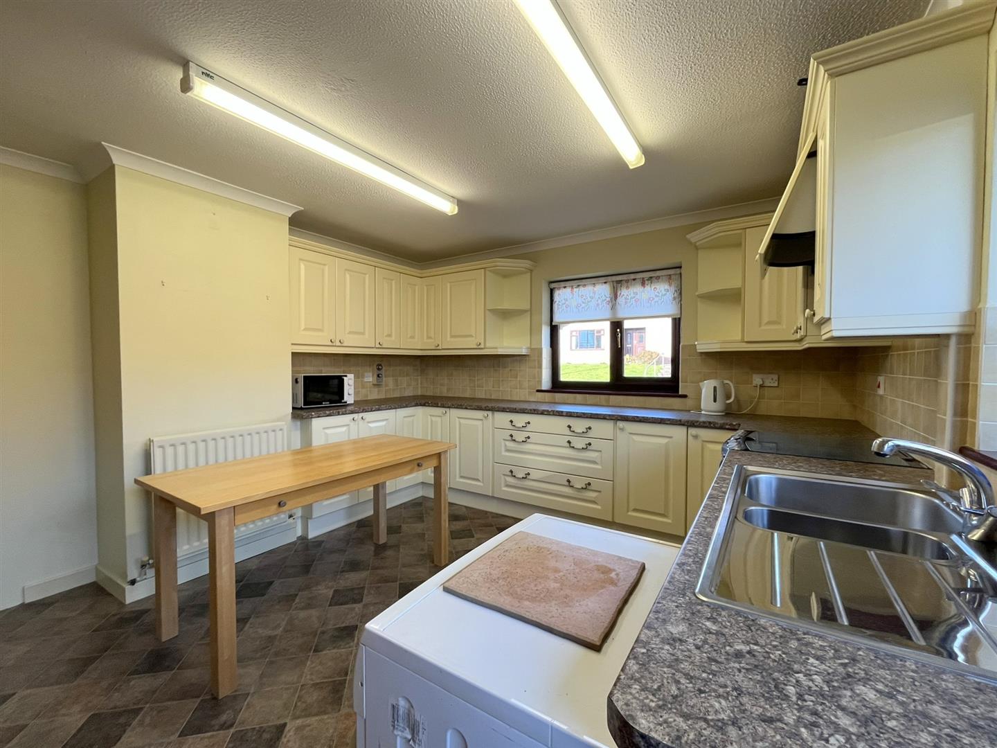 Two built-in cupboards, one used as a pantry cupboard and one housing the mains gas boiler. Coved ceiling, tile-effect vinyl floor, radiator.