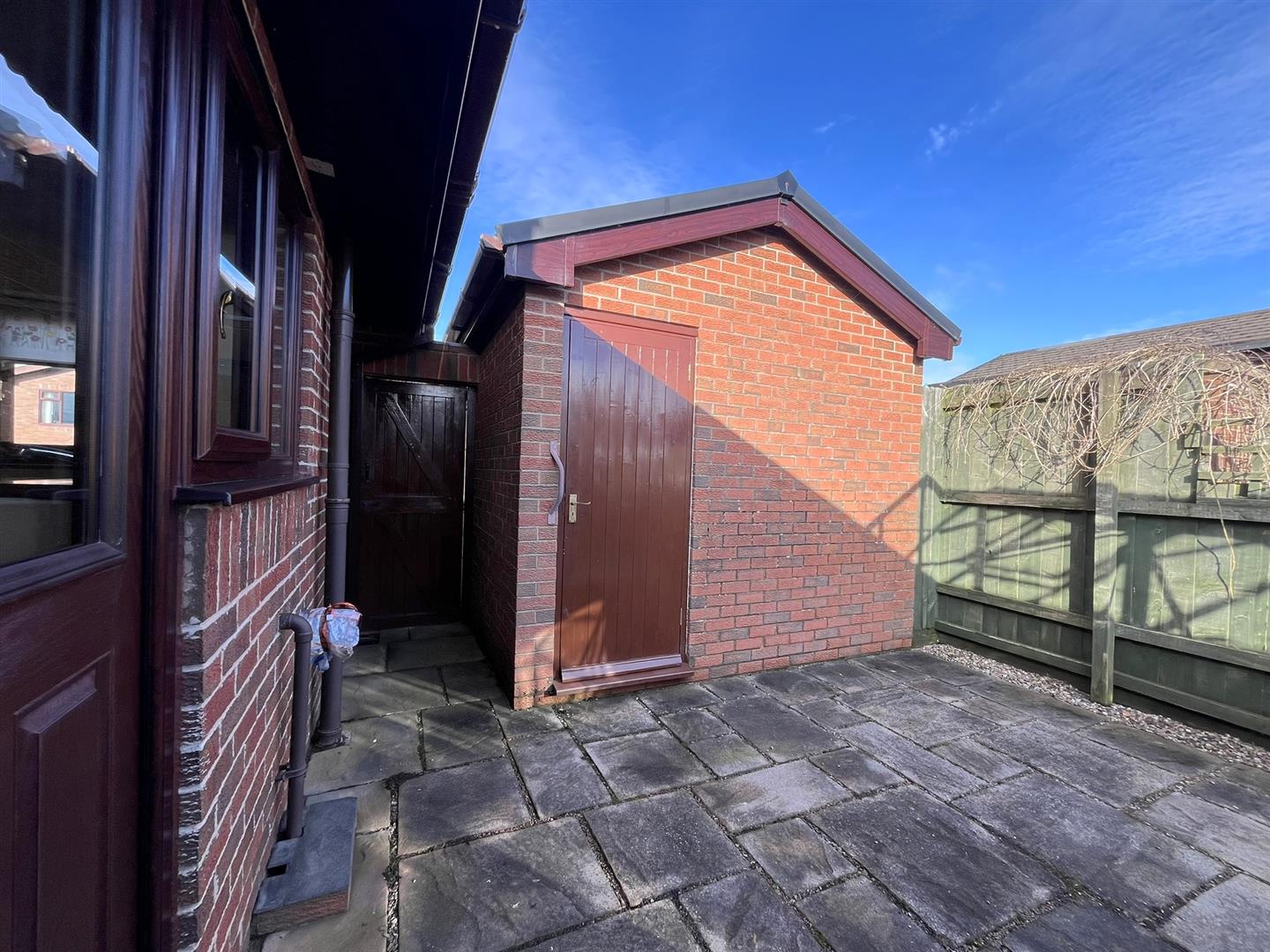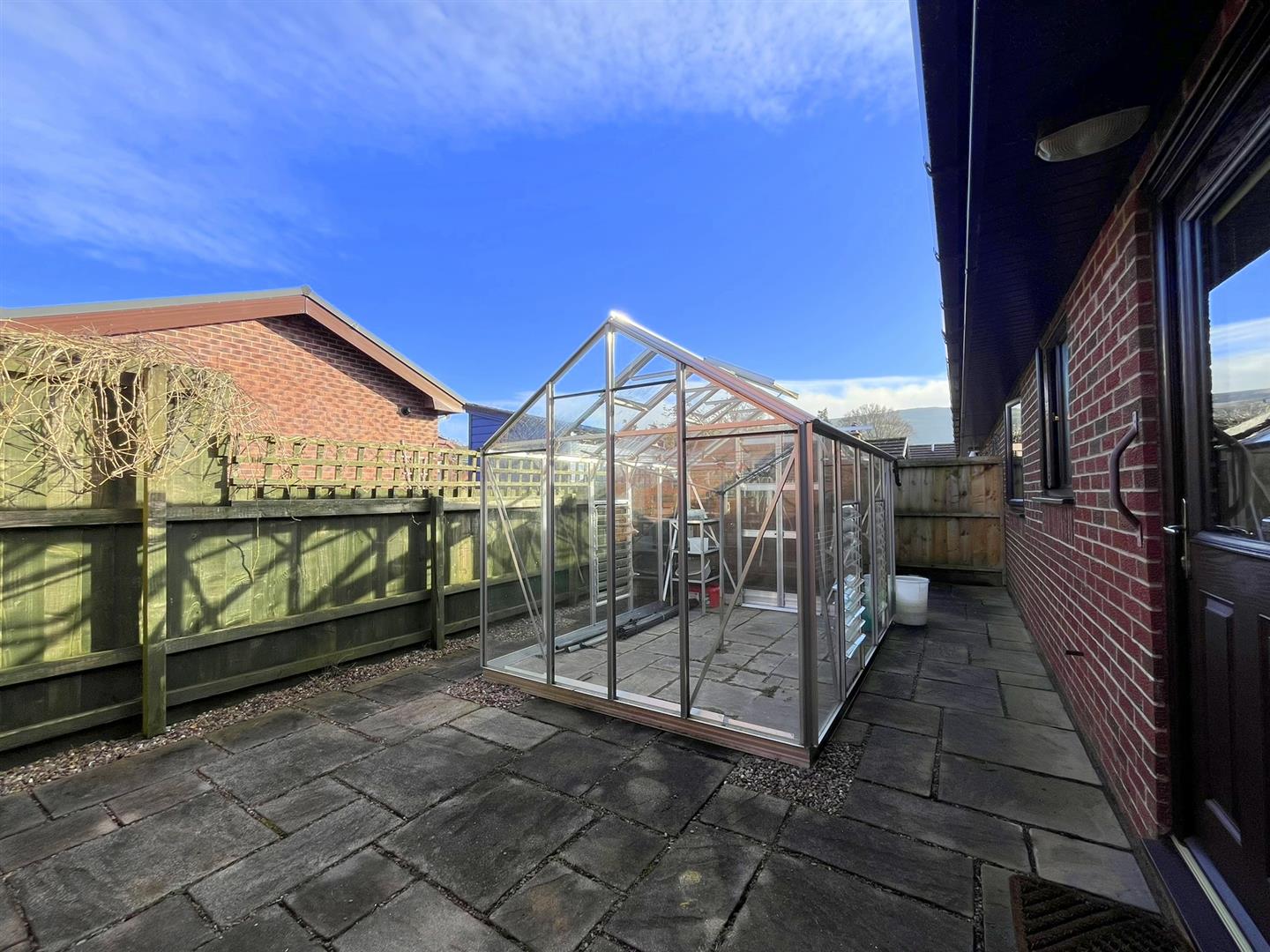 The property is approached over a slabbed pathway that leads to the front door and extends around to the side of the property. A gravelled path also leads to the external door at the rear of the property. The level front and side gardens are laid to lawn. The enclosed rear garden area is paved and has a large green house easily accessed from the bungalow, as well as a wood shed (the vendor will remove the greenhouse if it is not required by the purchaser).