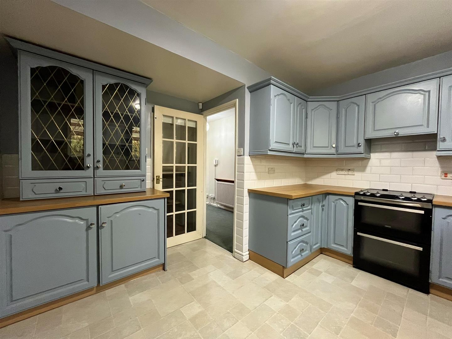 Excellent range of base, wall, glass display and open shelved units with worktops and tiled splashbacks over.