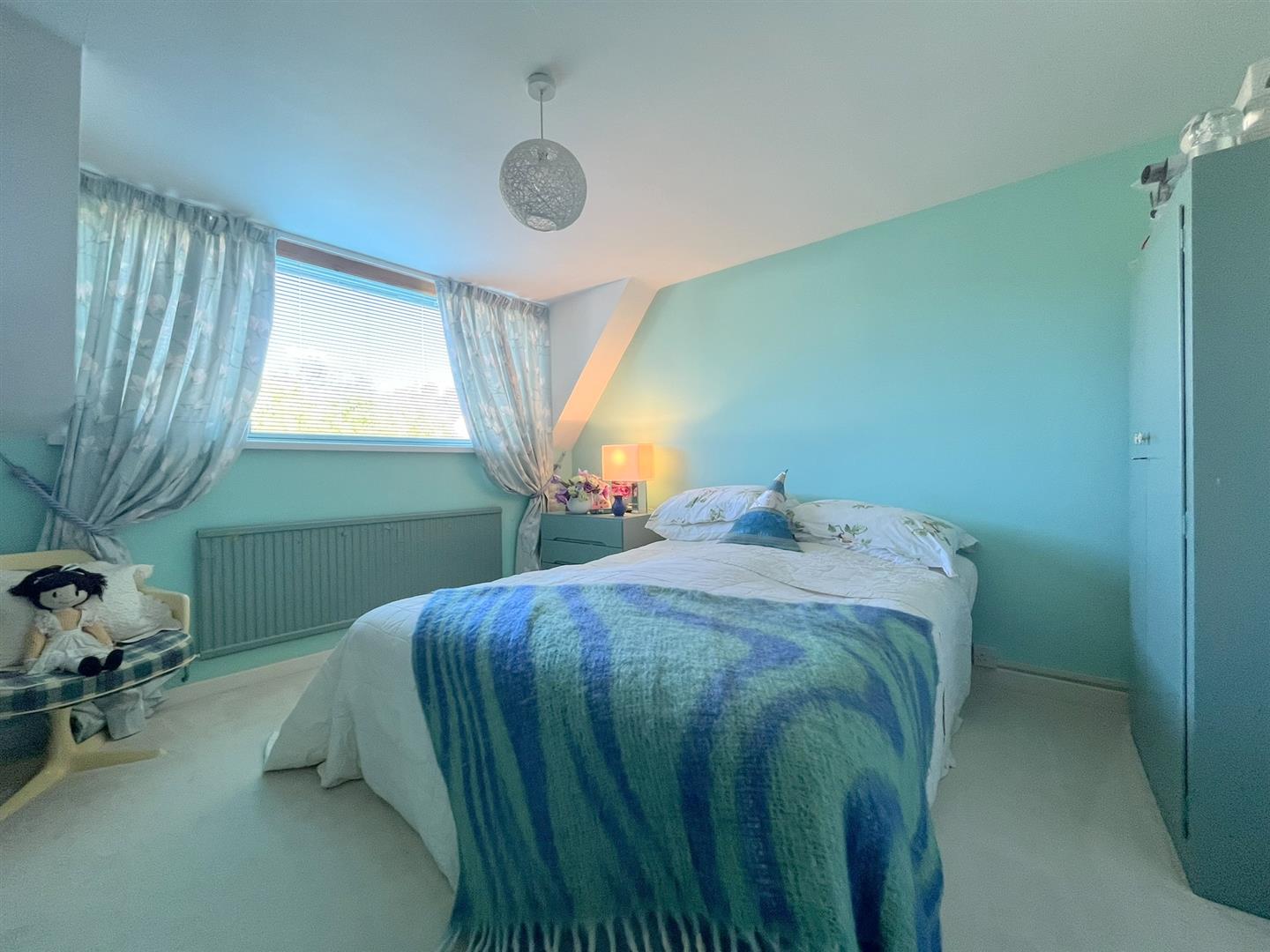 Coved ceiling, fitted carpet, radiator. Extensive fitted wardrobes, window to front. Part-sloping ceilings.