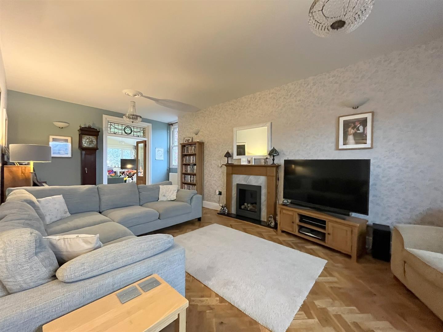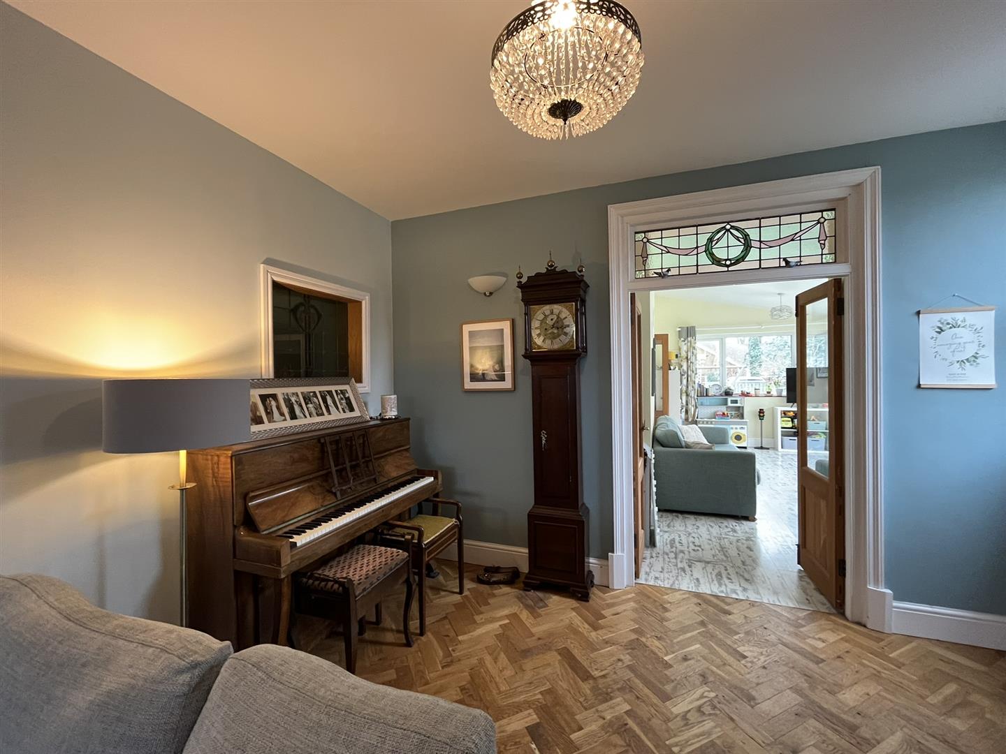 Inset mains gas log effect fire with marble hearth and back plate having wood mantel surround. Spacious room with parquet flooring throughout.
