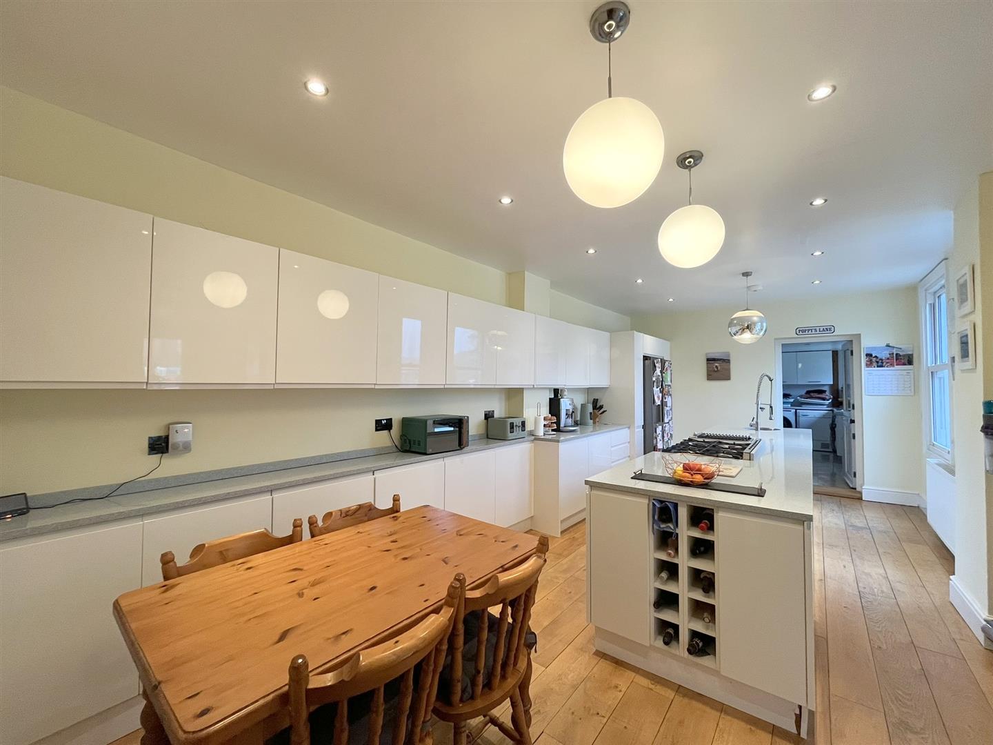 Excellent range of high gloss base and wall units with quartz worktops over. Slot-in double oven dual fuel cooker with 6 burner gas hob over. Inlaid charcoal grill.