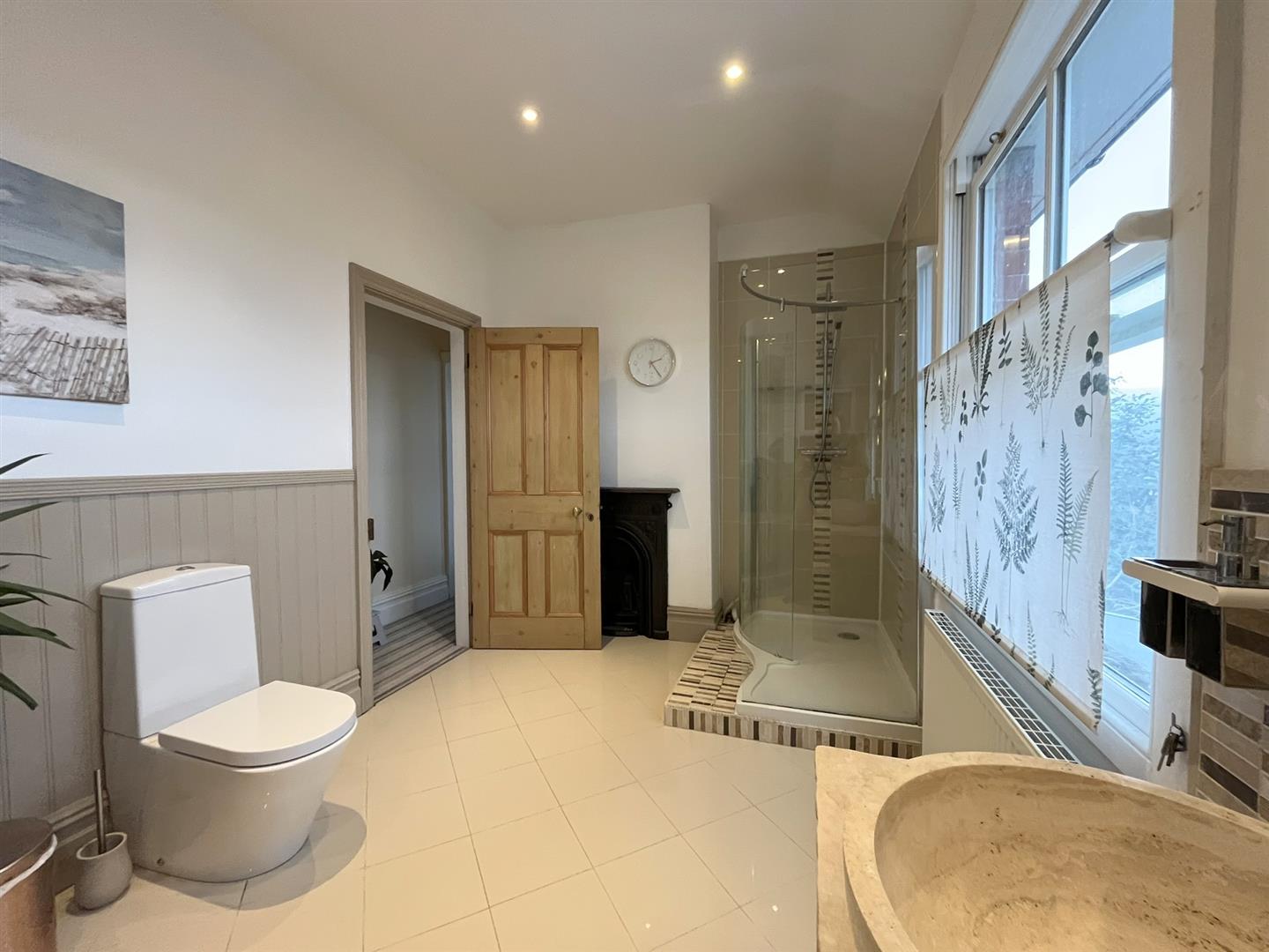 Walk-in shower unit with thermostatic shower and having fully tiled walls and floor. Two radiators, tiled floor, part panelled walls.