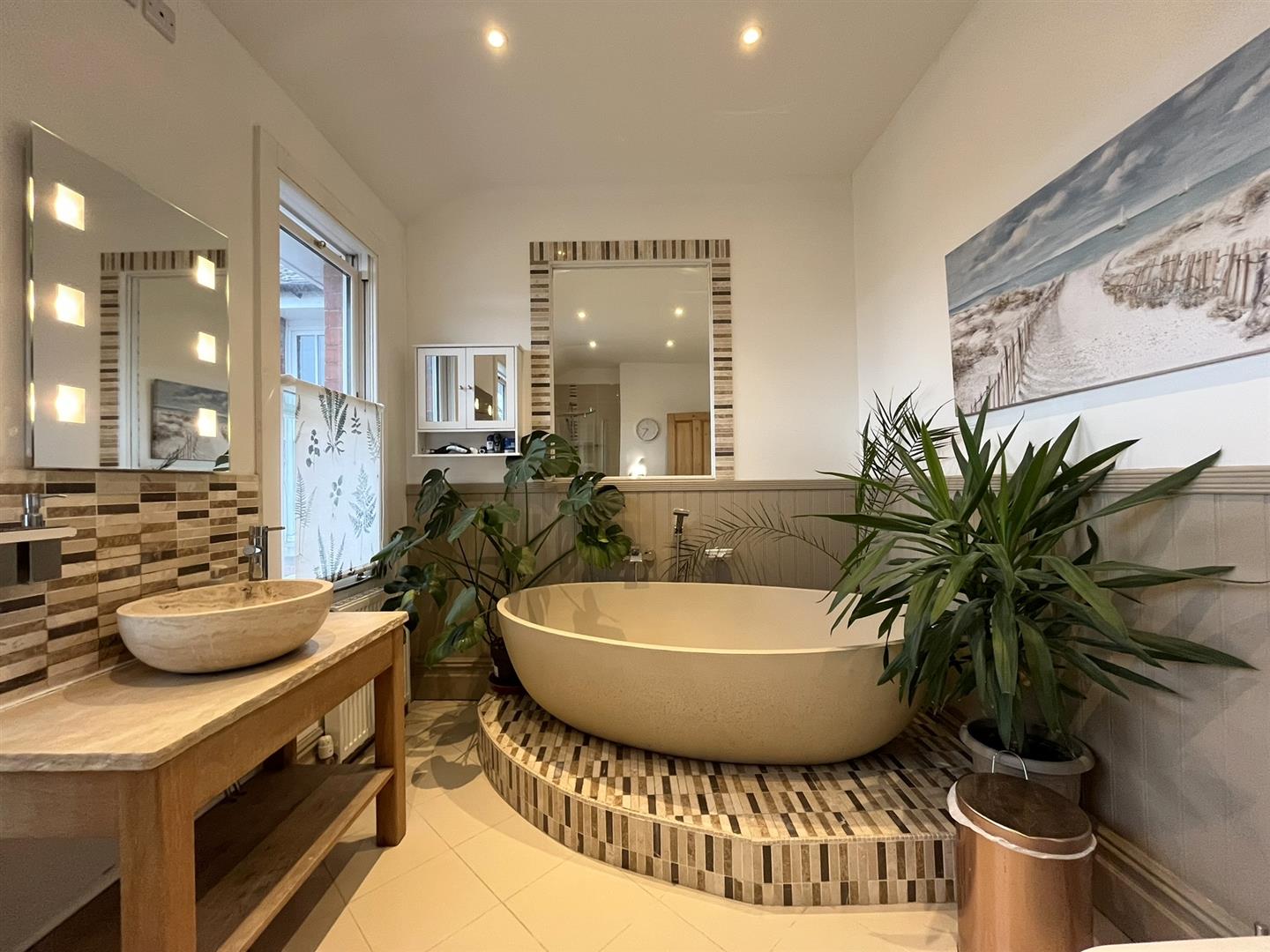 Well appointed, spacious bathroom with stone-effect oval shaped bath on a raised plinth. Stone basin with mixer tap set on stone and oak console.