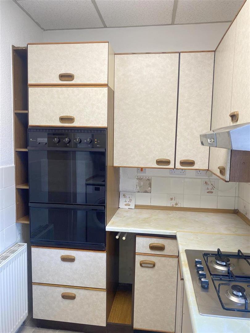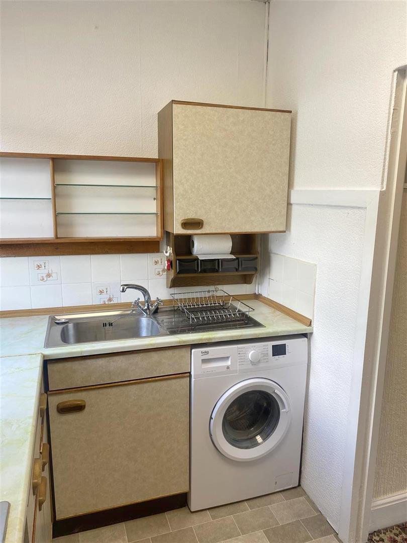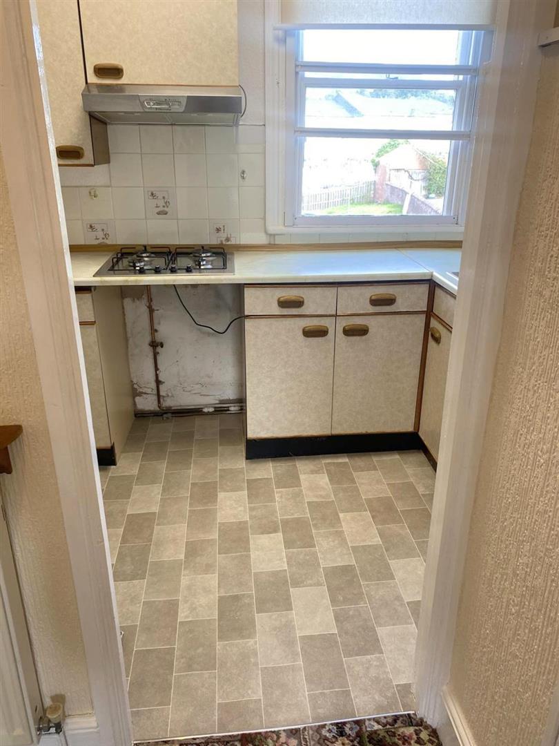 Small kitchen with lino floor, sash window to rear, gas hob with space under, built-in cooker, laminate worktop, built-in units, washing machine, stainless steel sink, mixer tap.