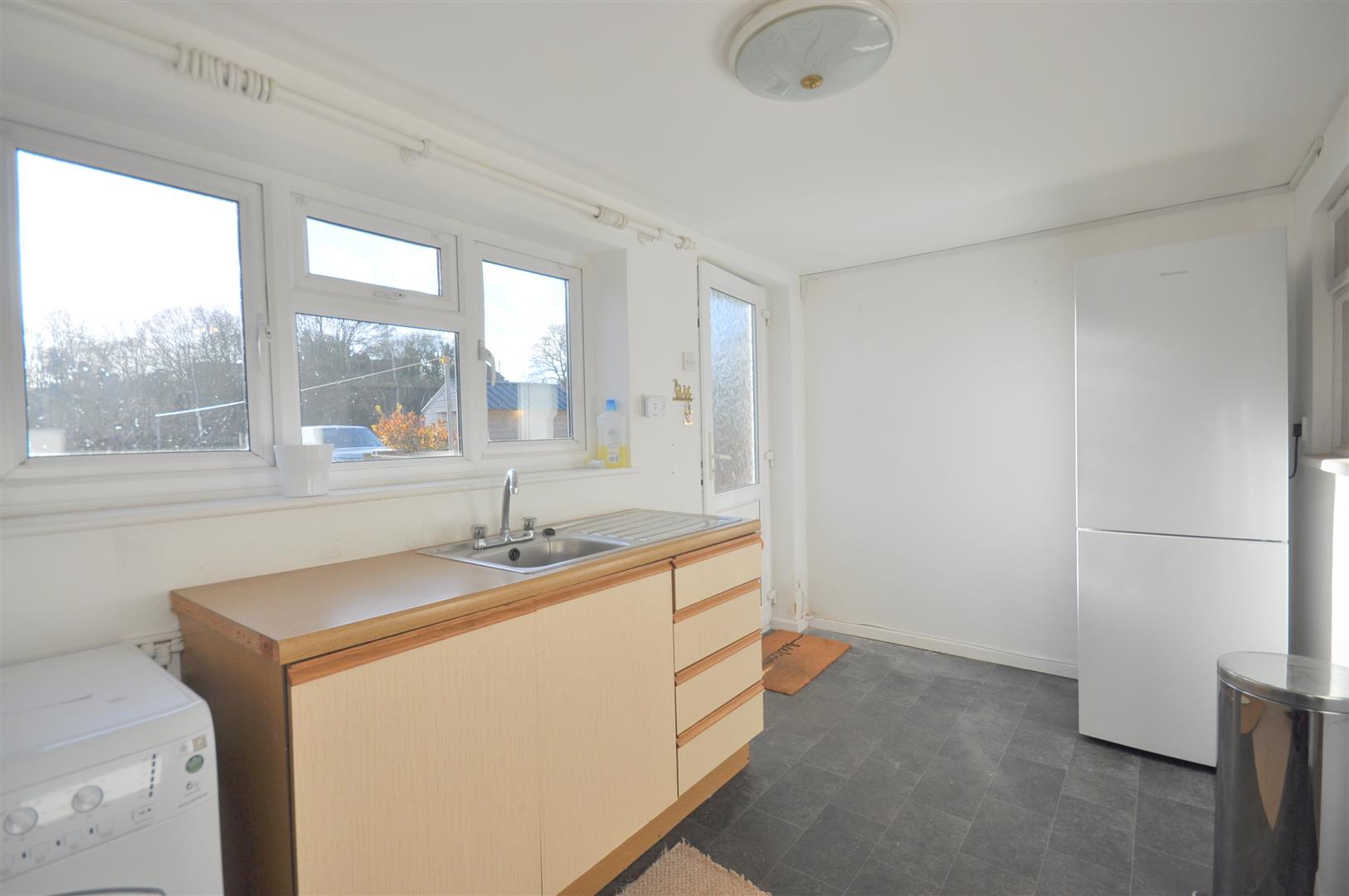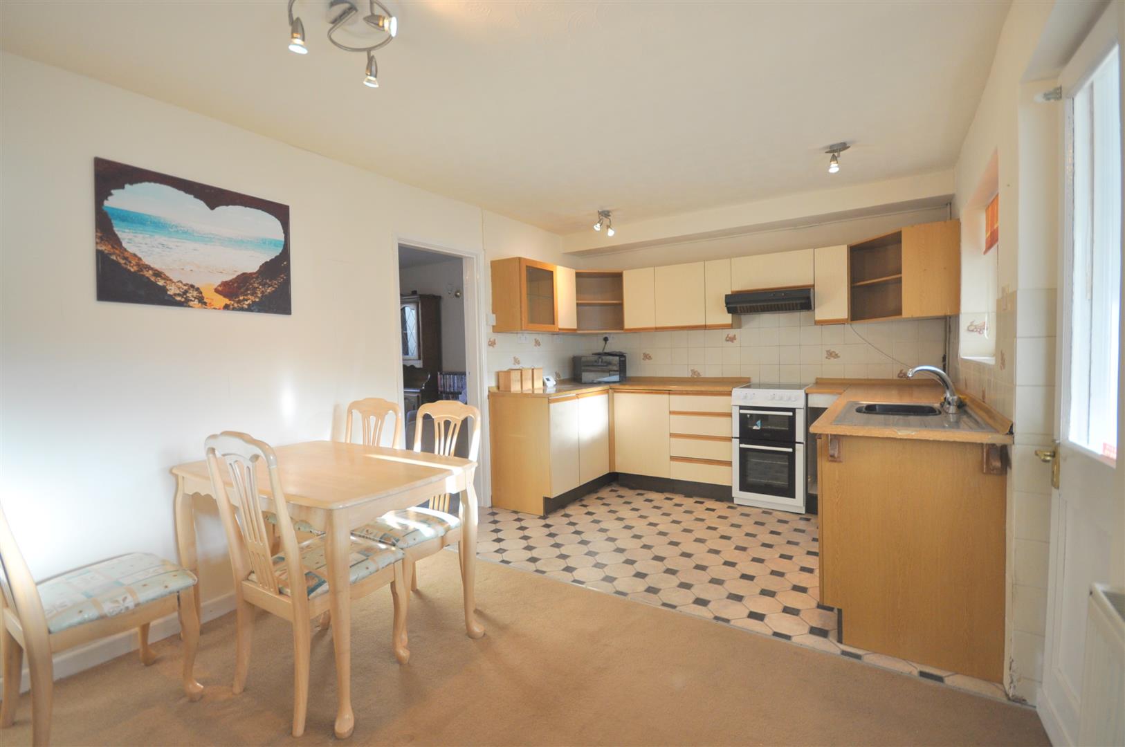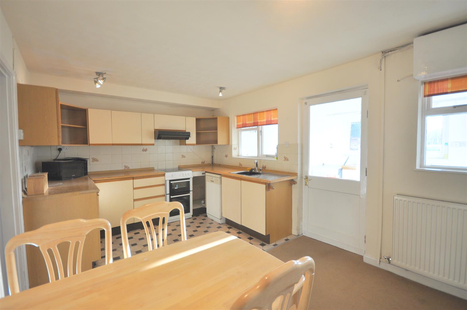 Good range of matching base and wall units and including electric double oven with ceramic hob over and slot-in dishwasher. Vinyl floor.