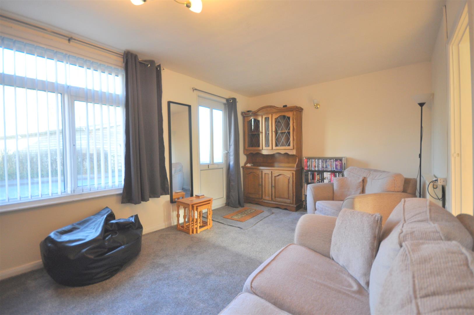 Fitted carpet. Radiator with fitted vertical blinds to front.