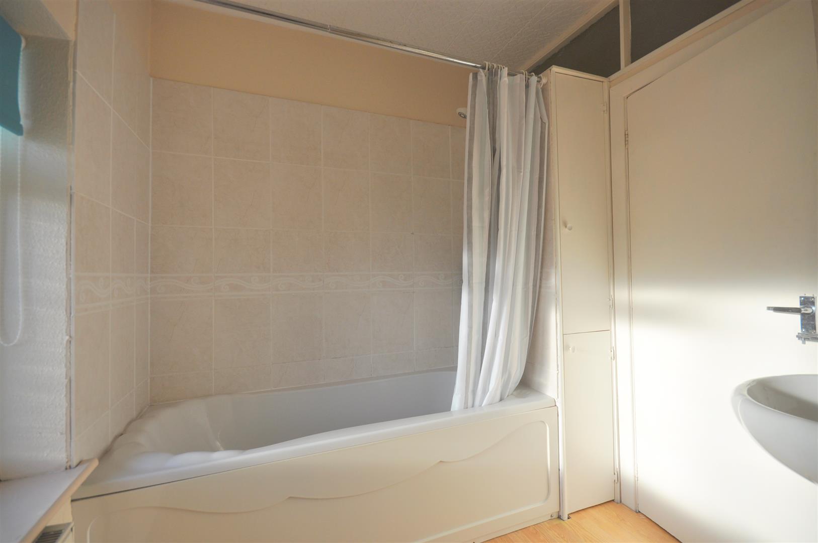 Panelled bath with electric shower heater, tiled surround and curtain rail.